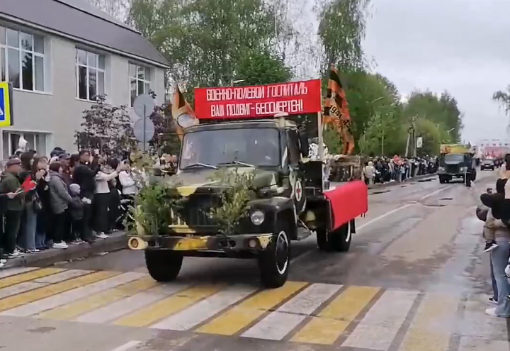 Пушкин, Колхоз, Бакча, Банк урамнары буйлап сугыш чорына туры китереп бизәлгән хәрби машина һәм мотоцикллар, бәйрәм демонстрациясендә катнашучылар уздылар