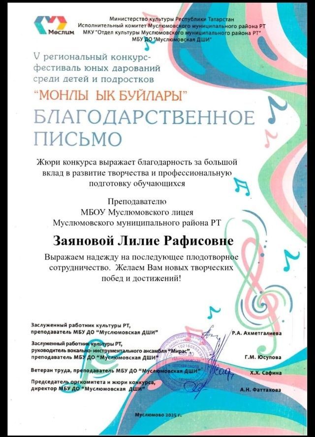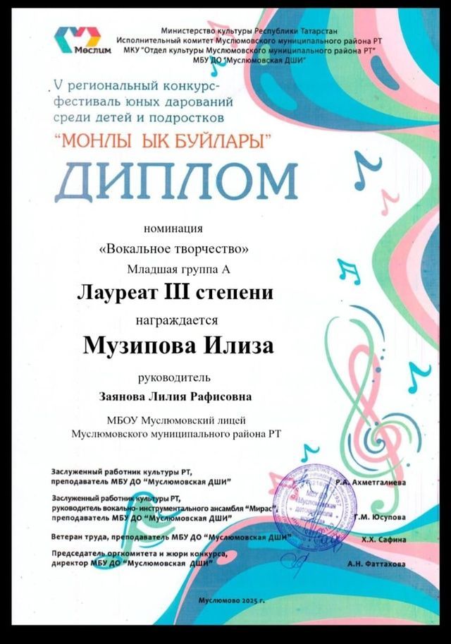 Мөслим лицееның "Көмеш нота" түгәрәгендә шөгыльләнүче Илиза Мөҗипова "Моңлы Ык буйлары" Vнче региональ балалар һәм яшүсмерләр фестивaлендә катнашып, "җыр" номинациясендә 3 нче дәрәжә лауреат дипломына лаек булды. Җитәксесе Заянова Лилия Рафис кызы бәйгенең рәхмәт хаты белән бүләкләнде. Бу хакта Мөслим лицее яза.