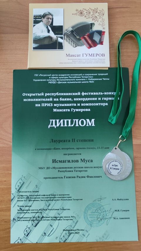 22 мартта Яр Чаллы шәһәрендә музыкант һәм композитор Максат Гомәров призына баян, аккордеон һәм гармунда уйнаучыларның ачык республика фестиваль-конкурсы узды. Конкурсның жюри составында Н. Җиһанов исемендәге Казан дәүләт консерваториясе профессоры, ТР атказанган артисты Фәйзуллин Абүзәр Әнвәр улы, ТР атказанган сәнгать эшлеклесе, композитор, башкаручы Гомәров Максат Илһам улы һәм ТР атказанган мәдәният хезмәткәре, 3нче мәктәп укытучысы Анисимов Михаил Александровичлар иде. Мөслим балалар сәнгать мәктәбенең 8 класс укучысы Муса Исмәгыйлев (укытучысы Радик Газизов) һәм 2 класс укытучысы Искәндәр Исмәгыйлев (укытучысы Раилә Әхмәтгалиева) конкурста уңышлы чыгыш ясап, 2, 3 дәрәҗә лауреат исемен һәм истәлекле бүләкләр алдылар.