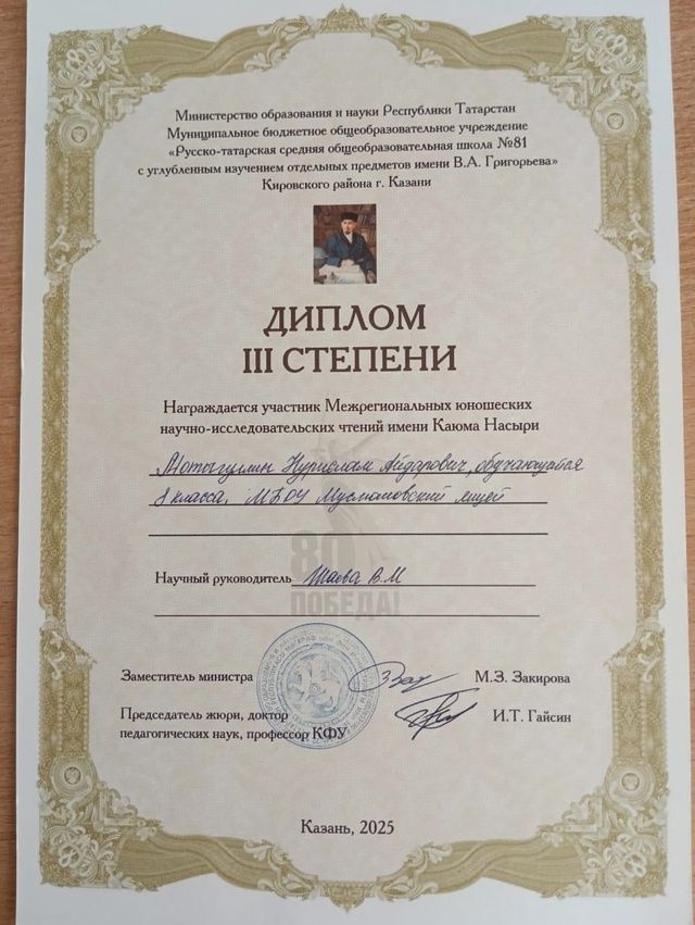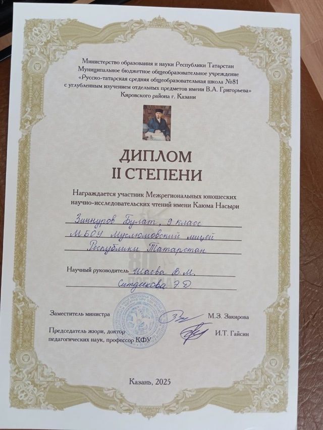 28 март көнне Казан шәһәрендә «Насыйри укулары» дип исемләнгән төбәкара фәнни-гамәли конференция узды. Әлеге конференциядә 9б сыйныфы укучысы Зиннуров Булат 2 нче дәрәҗә диплом, 8в сыйныфы укучысы Мотыгуллин Нурислам 3 нче дәрәҗә дипломга лаек булдылар. Җитәкчеләре – Шаева Венера Мнахир кызы, Ситдыйкова Эльвера Дамир кызы. Бу хакта Мөслим лицее хәбәр итә.