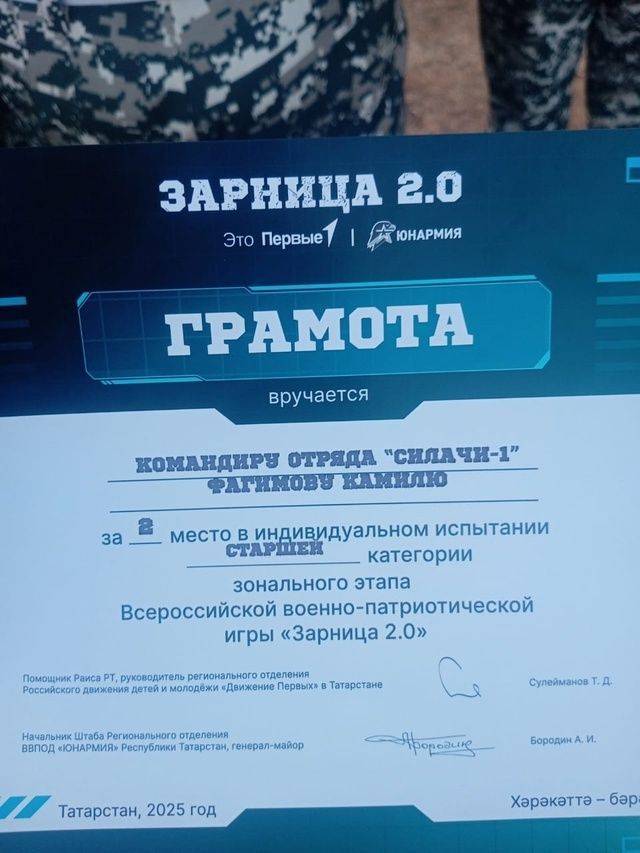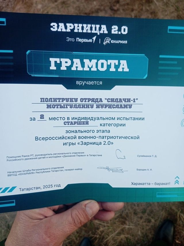 "Отряд командиры Камил Фәһимов һәм политрук Нурислам Мотыгуллин шәхси сынауларда 2нче урыннарны яуладылар һәм грамоталар белән бүләкләнделәр. Укучыларны ярышларга Таһир Хатбуллин әзерләде", - дип хәбәр итәләр Мөслим лицееннан.