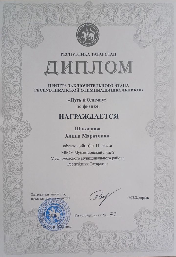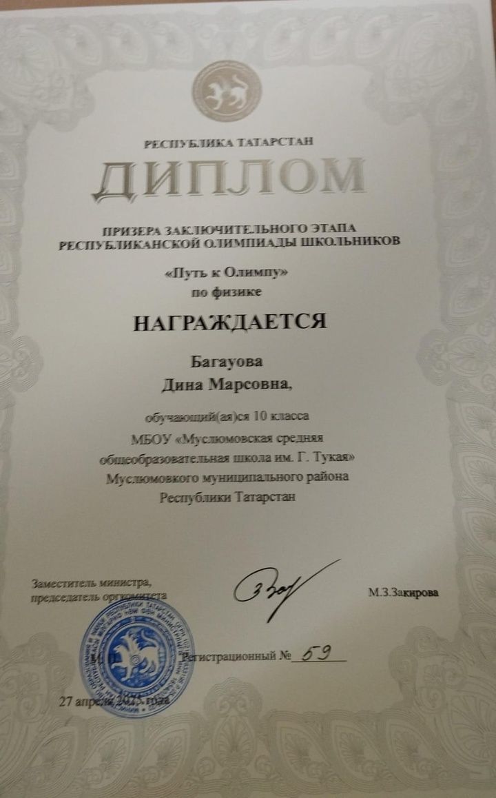 Г.Тукай исемендәге Мөслим урта мәктәбенең 10 сыйныф укучысы Динә Баһауова, 7 сыйныфтан Марат Үтәбаев (укытучылары - Лилия Минниярова), Мөслим лицееның 11 сыйныфыннан Алина Шакирова (укытучысы - Эльвир Зарипов) физика буенча "Олимпка юл" республика олимпиадасы призерлары булдылар.